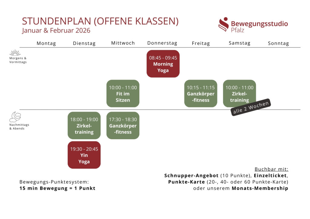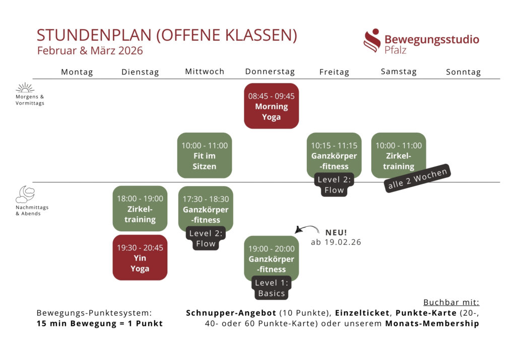 Hier findest du unseren aktuellen Stundenplan – alle Klassen, Kurse, Workshops & Events kannst du bequem über Eversports buchen und deine persönliche Bewegungszeit planen!